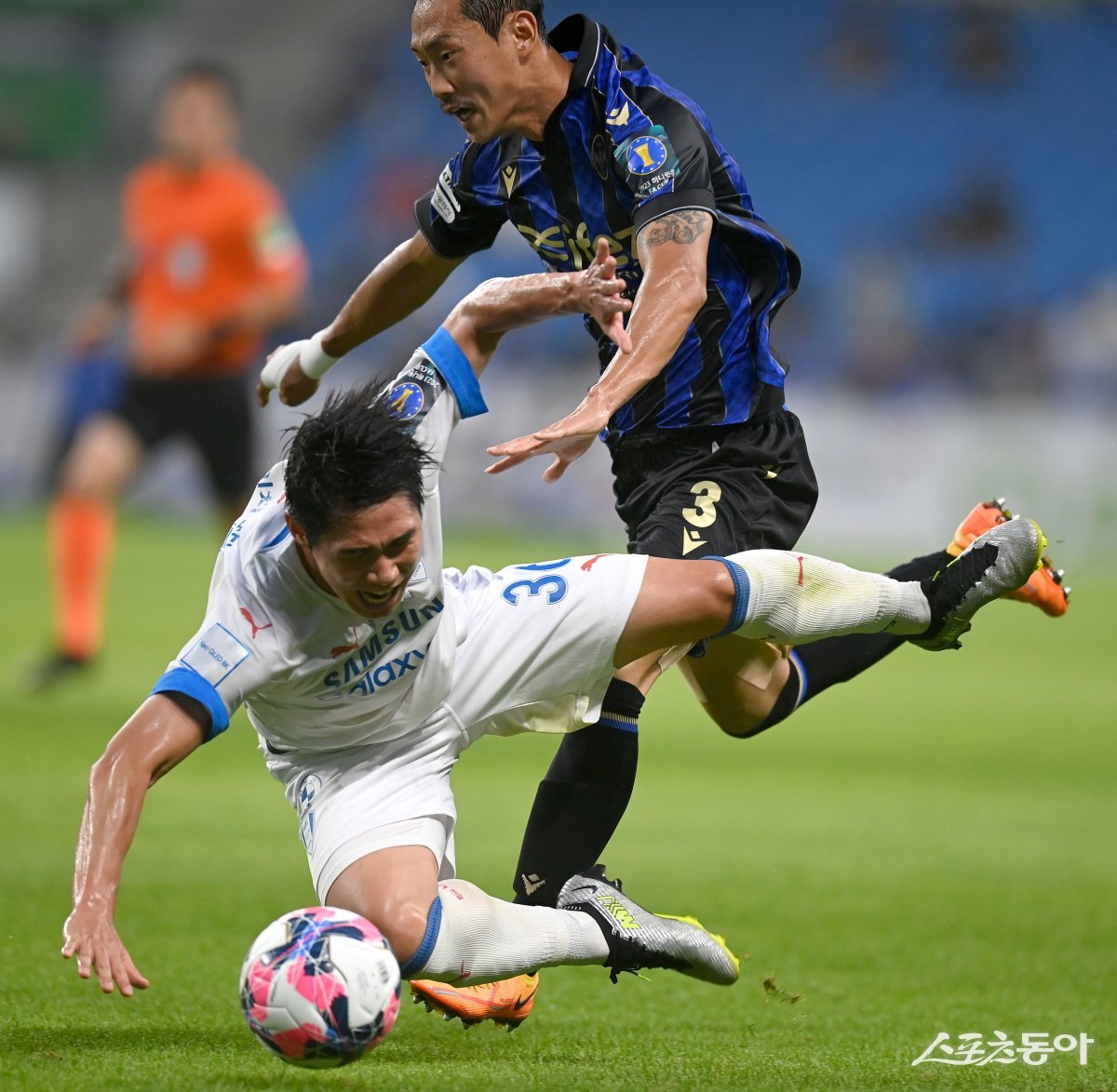 28일 인천축구전용경기장에서 열린 프로축구 ‘2023 하나원큐 대한축구협회(FA)컵’ 8강전 인천과 수원 경기에서 수원 명준재와 인천 김연수가 볼다툼을 하고 있다.