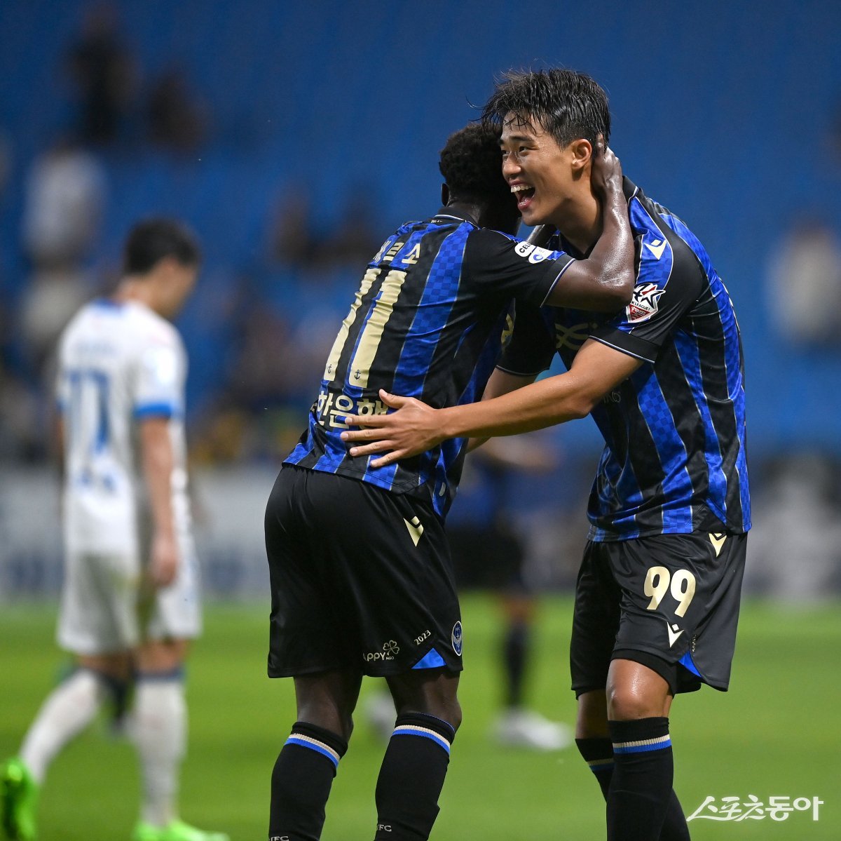 인천 천성훈(오른쪽)이 28일 인천축구전용경기장에서 열린 수원과 ‘2023 하나원큐 FA컵’ 8강전 후반 9분 역전 결승골을 터트린 뒤 도움을 준 제르소와 기쁨을 나누고 있다. 천성훈의 멀티골 활약에 힘입어 인천이 3-2 승리를 거두고 사상 첫 FA컵 우승을 향해 한 발 더 나아갔다. 인천 | 김종원 기자 won@donga.com