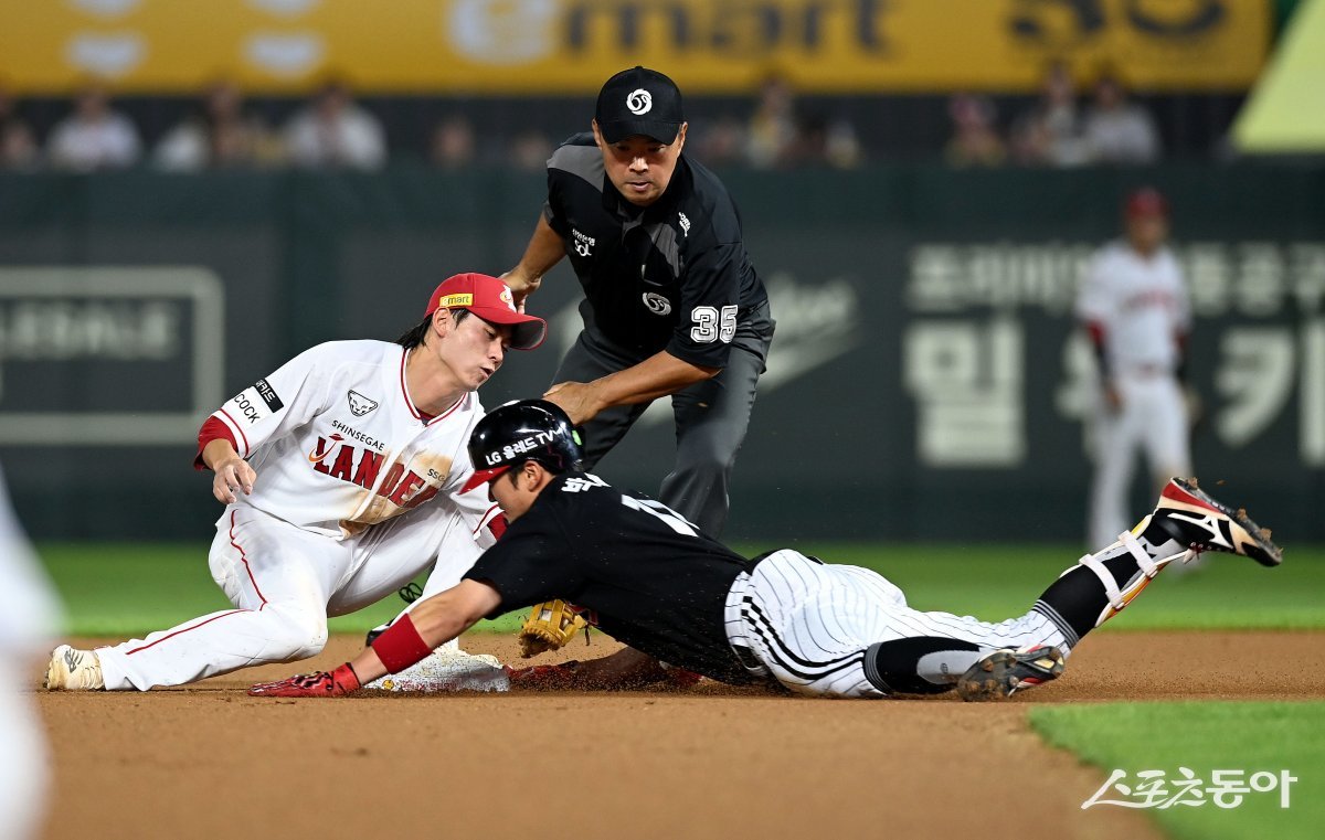 28일 인천 SSG 랜더스필드에서 ‘2023 신한은행 SOL KBO리그’ SSG 랜더스와 LG 트윈스의 경기가 열렸다. 8회초 무사에서 LG 박해민이 2루타를 날린 후 슬라이딩 세이프 되고 있다. SSG가 비디오판독을 요청했으나 세이프.