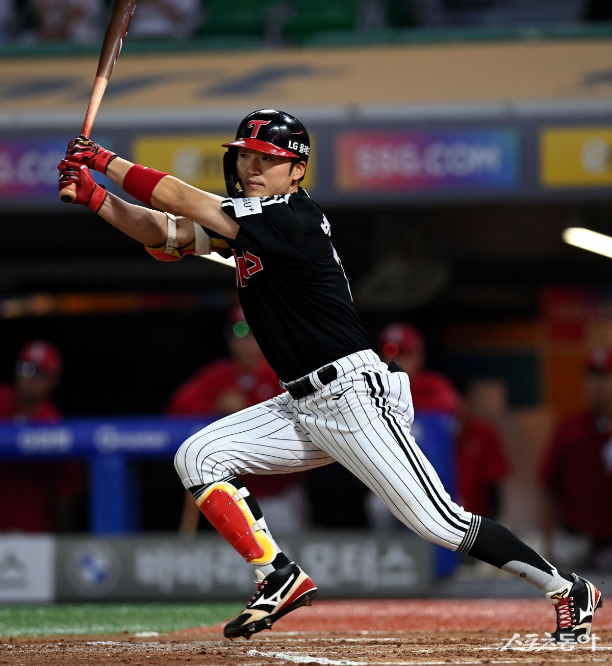 28일 인천 SSG 랜더스필드에서 ‘2023 신한은행 SOL KBO리그’ SSG 랜더스와 LG 트윈스의 경기가 열렸다. 8회초 무사에서 LG 박해민이 2루타를 날리고 있다.