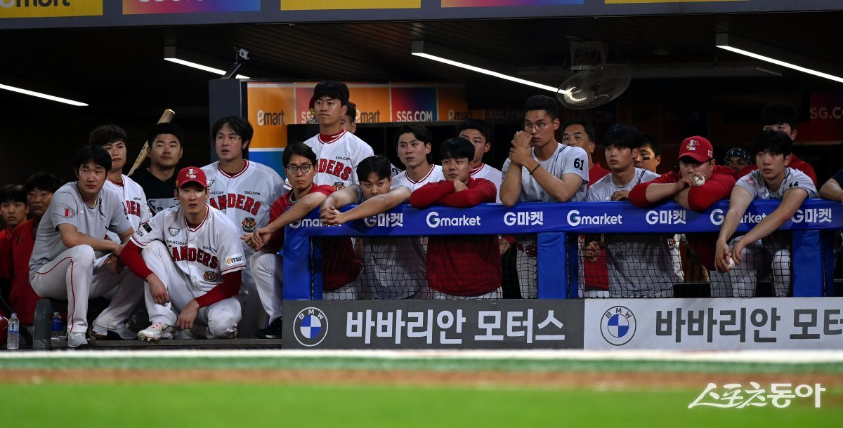 28일 인천 SSG 랜더스필드에서 ‘2023 신한은행 SOL KBO리그’ SSG 랜더스와 LG 트윈스의 경기가 열렸다. LG에 6-8로 뒤진 SSG 9회말 마지막 공격 때 선수들이 경기르 지켜보고 있다.