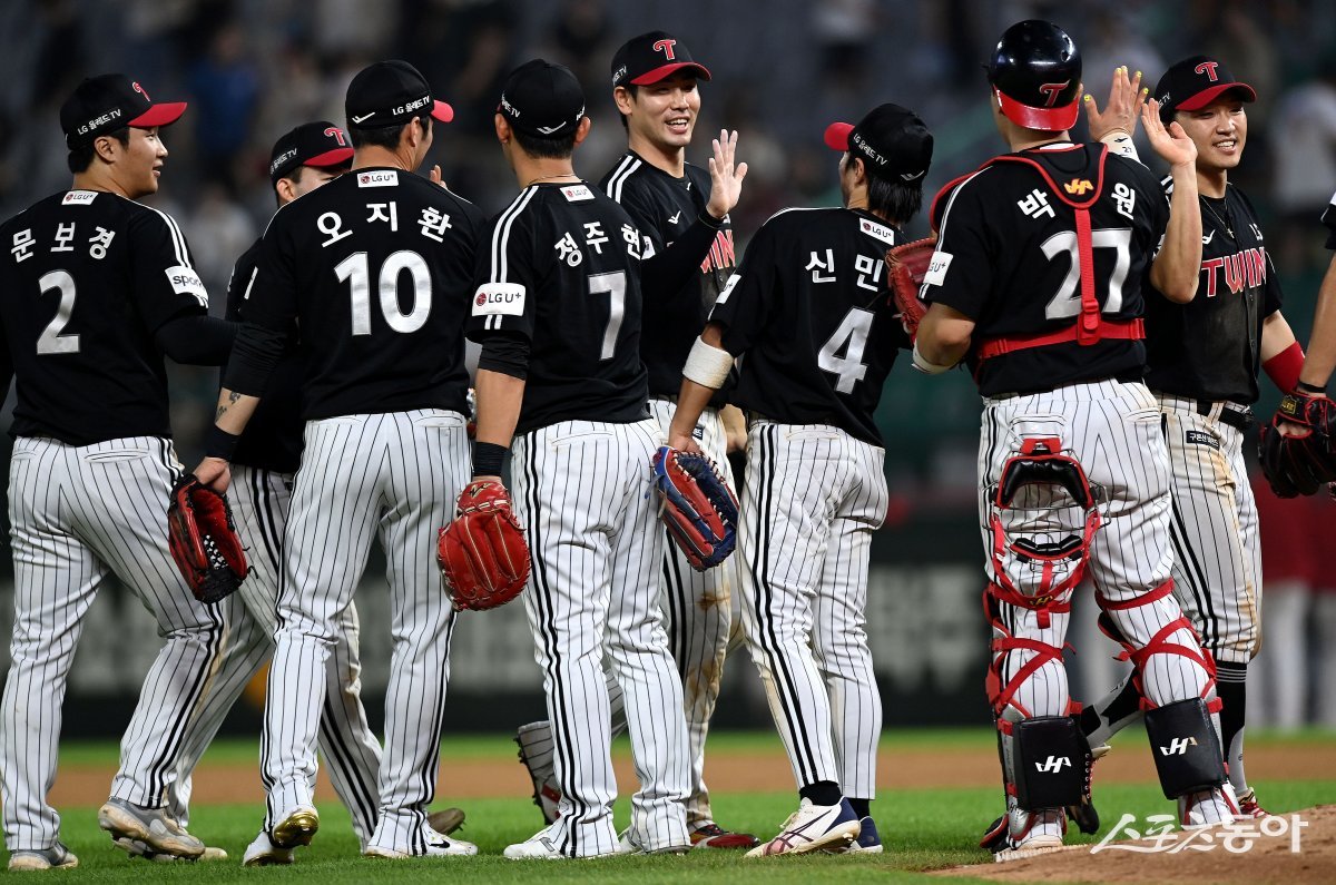 28일 인천 SSG 랜더스필드에서 ‘2023 신한은행 SOL KBO리그’ SSG 랜더스와 LG 트윈스의 경기가 열렸다. LG가 SSG를 상대로 8-6으로 승리한 후 선수들이 그라운드에서 기쁨을 나누고 있다.