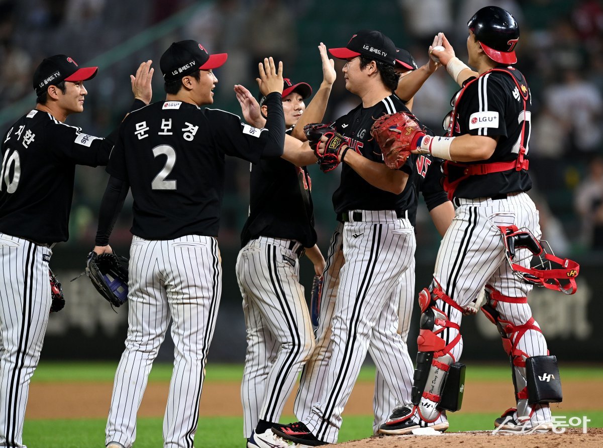 28일 인천 SSG 랜더스필드에서 ‘2023 신한은행 SOL KBO리그’ SSG 랜더스와 LG 트윈스의 경기가 열렸다. LG가 SSG를 상대로 8-6으로 승리한 후 선수들이 그라운드에서 기쁨을 나누고 있다.