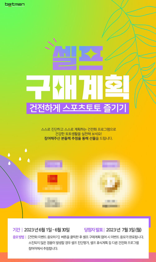 국민체육진흥공단에서 발행하는 체육진흥투표권 스포츠토토의 공식 온라인 발매 사이트 베트맨이 2023년 6월 건전화 이벤트인 “셀프 구매계획으로 건전하게 스포츠토토 즐기기”를 30일(금)까지 진행한다.-스스로 건전구매 습관 만들 수 있는 프로그램 참여 가능