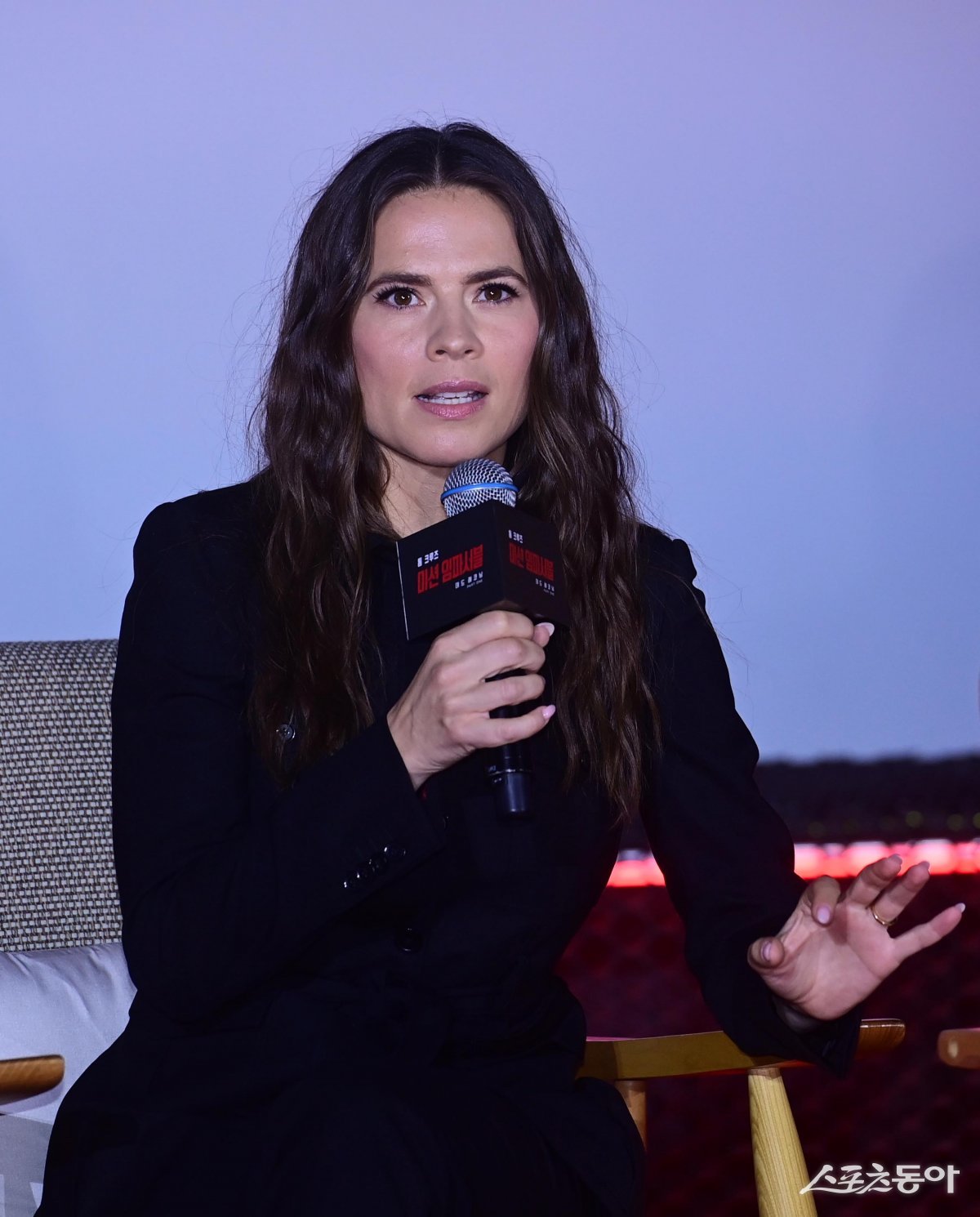 배우 헤일리 앳웰이 29일 서울 송파구 신천동 롯데시네마 월드타워점에서 열린 영화 ‘미션 임파서블: 데드 레코닝 PART ONE’ 내한 프레스 컨퍼런스에서 진행자의 질문에 답하고 있다.