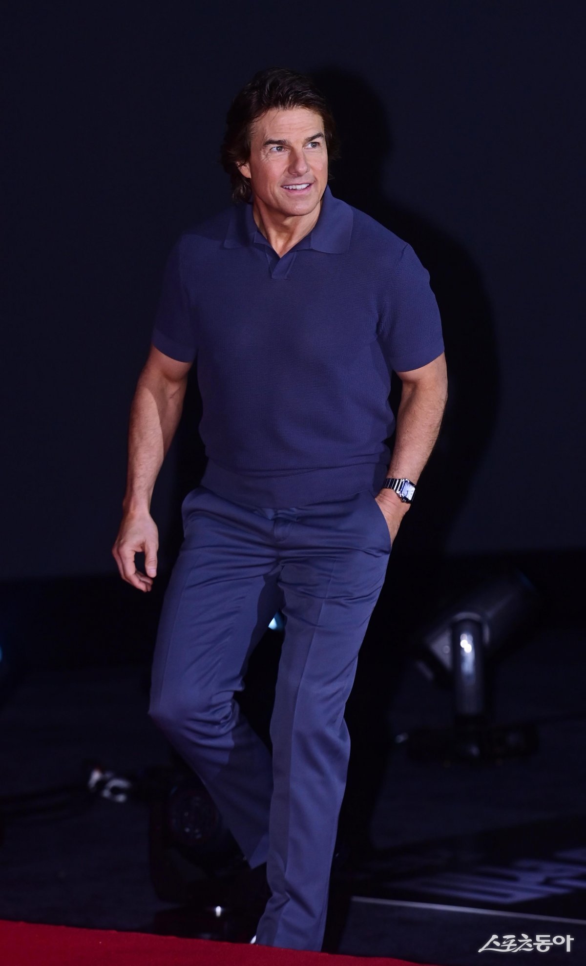 배우 톰 크루즈가 29일 서울 송파구 신천동 롯데시네마 월드타워점에서 열린 영화 ‘미션 임파서블: 데드 레코닝 PART ONE’ 내한 프레스 컨퍼런스 무대에 오르고 있다.