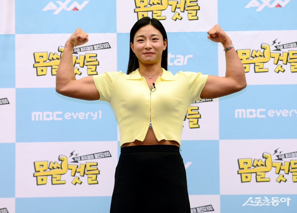 29일 서울 마포구 스탠포드호텔에서 AXN·Kstar·MBC에브리원 예능 ‘몸쓸것들:S급 피지컬의 챌린지 100’ 제작발표회에 참석한 장은실이 카메라를 향해 포즈를 취하고 있다.