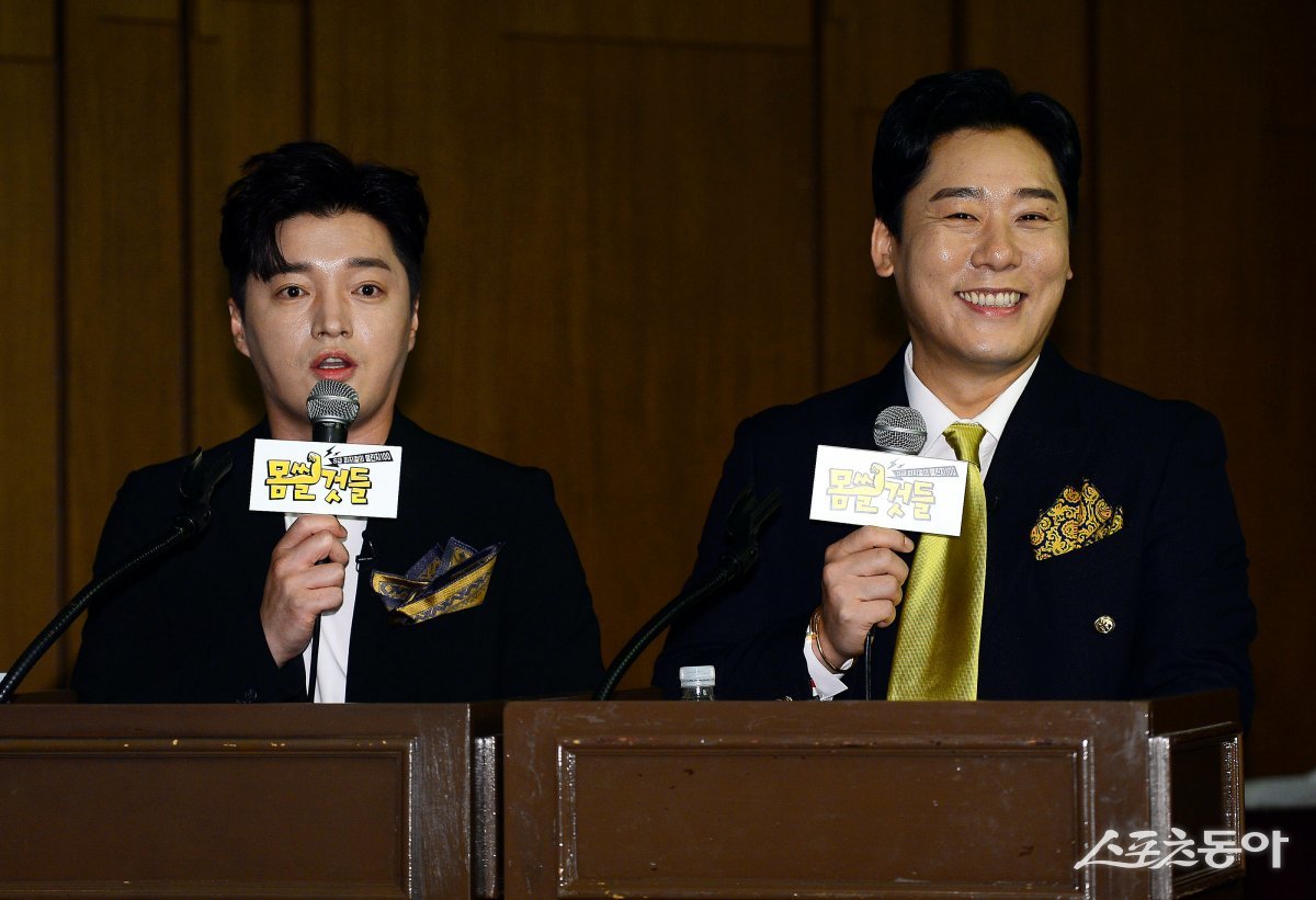 29일 서울 마포구 스탠포드호텔에서 AXN·Kstar·MBC에브리원 예능 ‘몸쓸것들:S급 피지컬의 챌린지 100’ 제작발표회에 참석한 남호연, 최성민이 행사를 진행하고 있다.
