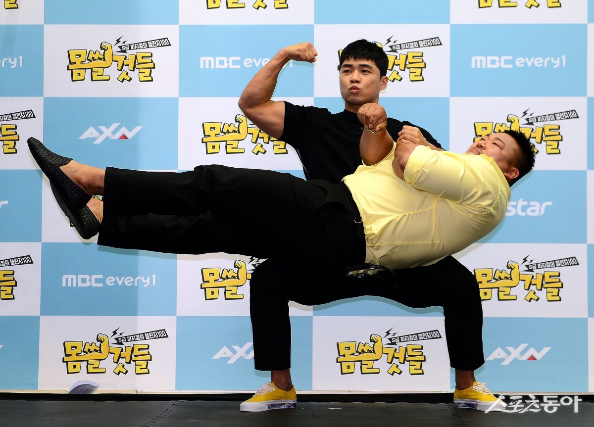 29일 서울 마포구 스탠포드호텔에서 AXN·Kstar·MBC에브리원 예능 ‘몸쓸것들:S급 피지컬의 챌린지 100’ 제작발표회에 참석한 조진형, 마선호가 챌린지를 펼치고 있다.