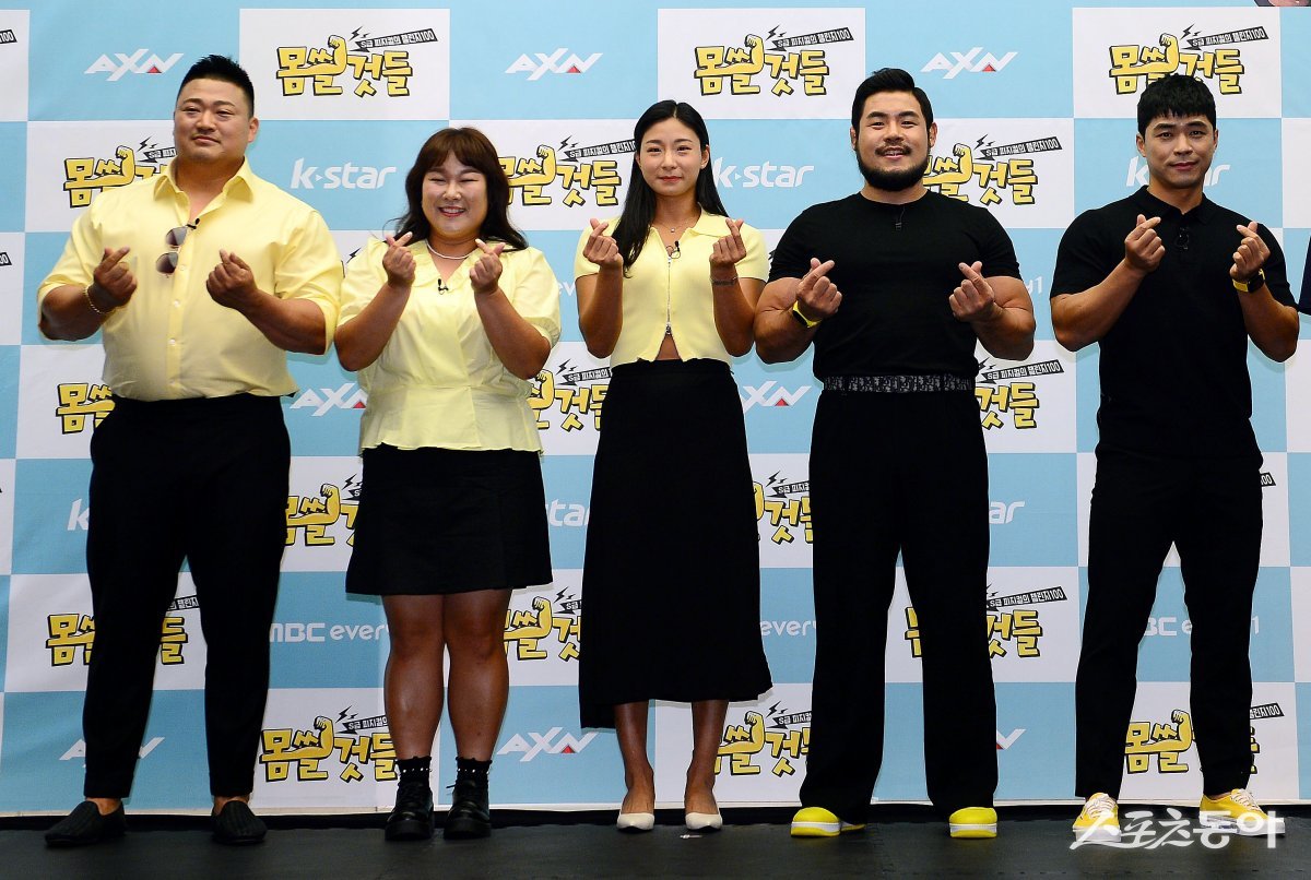 29일 서울 마포구 스탠포드호텔에서 AXN·Kstar·MBC에브리원 예능 ‘몸쓸것들:S급 피지컬의 챌린지 100’ 제작발표회에 참석한 조진형, 김민경, 장은실, 남경진, 마선호가 카메라를 향해 포즈를 취하고 있다.
