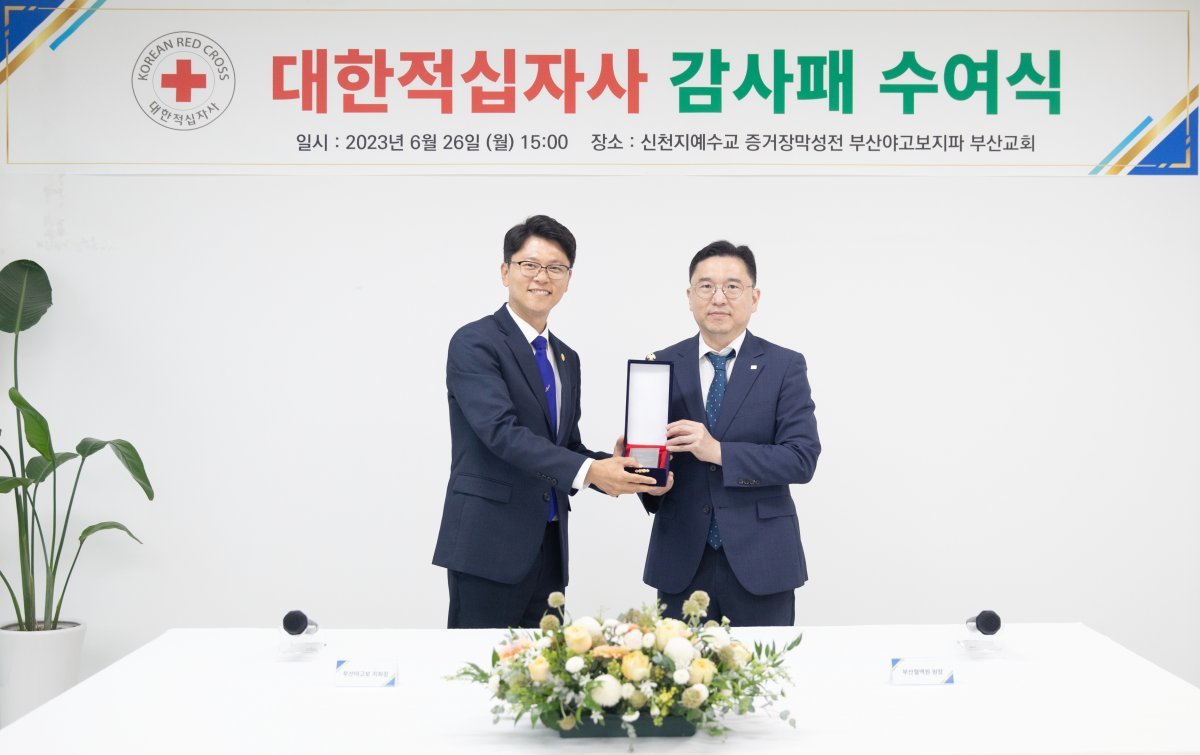 대한적십자사 부산혈액원은 지난 26일 ‘세계 헌혈자의 날(6월 14일)’을 기념해 김봉균 부산혈액원장이 신천지 부산야고보지파 성전을 직접 방문해 임정환 지파장에게 감사패를 전달했다.