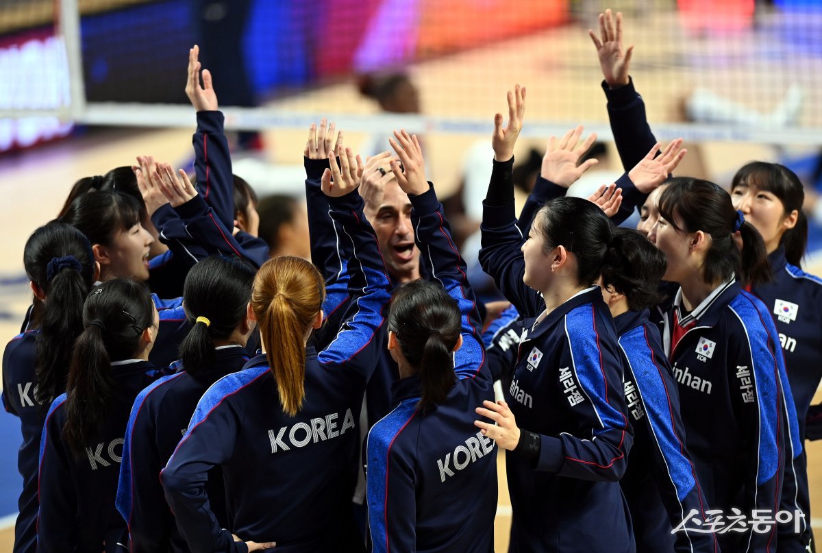 29일 경기도 서수원칠보체육관에서 ‘2023 국제배구연맹(FIVB) 발리볼네이션스리그(VNL)’ 한국과 도미니카공화국의 경기가 열린다. 경기 전 한국여자배구대표팀 선수들이 선전을 다짐하고 있다.
