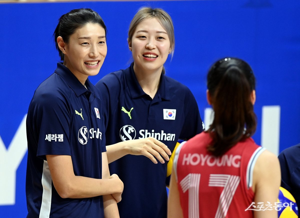 29일 경기도 서수원칠보체육관에서 ‘2023 국제배구연맹(FIVB) 발리볼네이션스리그(VNL)’ 한국과 도미니카공화국의 경기가 열린다. 경기 전 김연경 어드바이저가 선수들과 이야기를 나누고 있다.