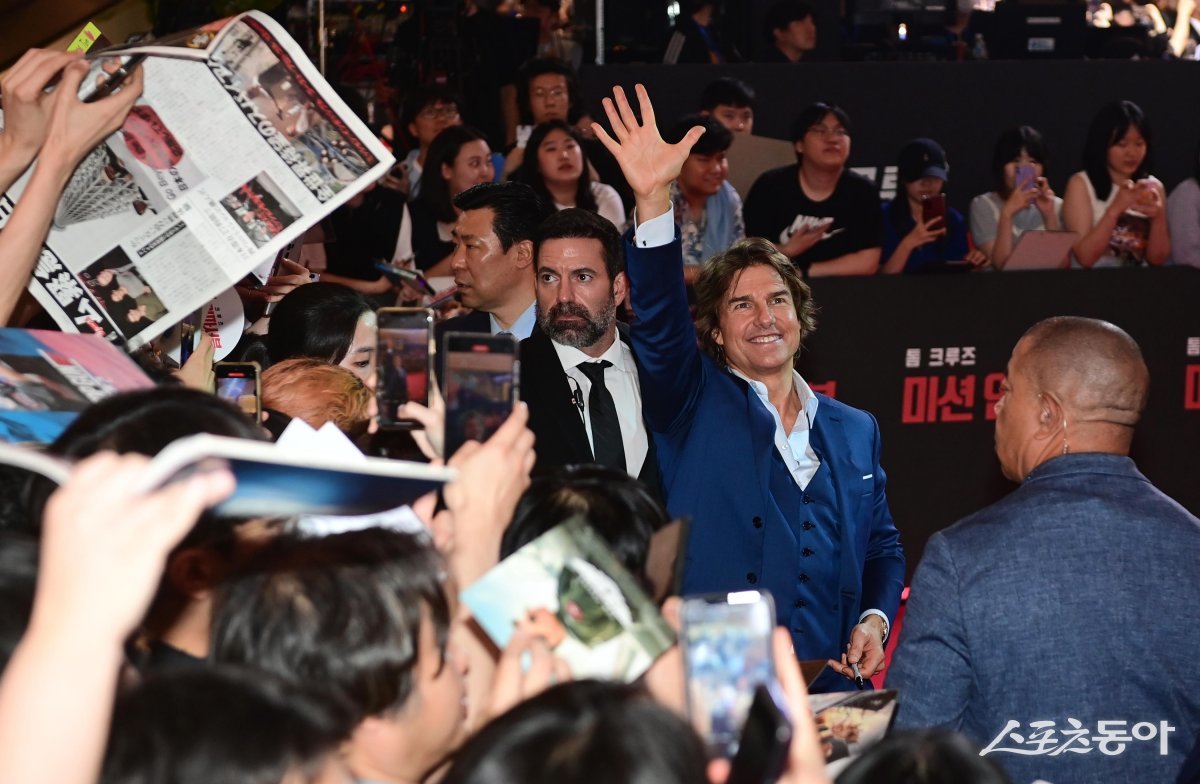 배우 톰 크루즈가 29일 서울 송파구 신천동 롯데월드타워몰에서 열린 영화 ‘미션 임파서블: 데드 레코닝 PART ONE’ 레드카펫 행사에서 팬들에게 인사하고 있다.