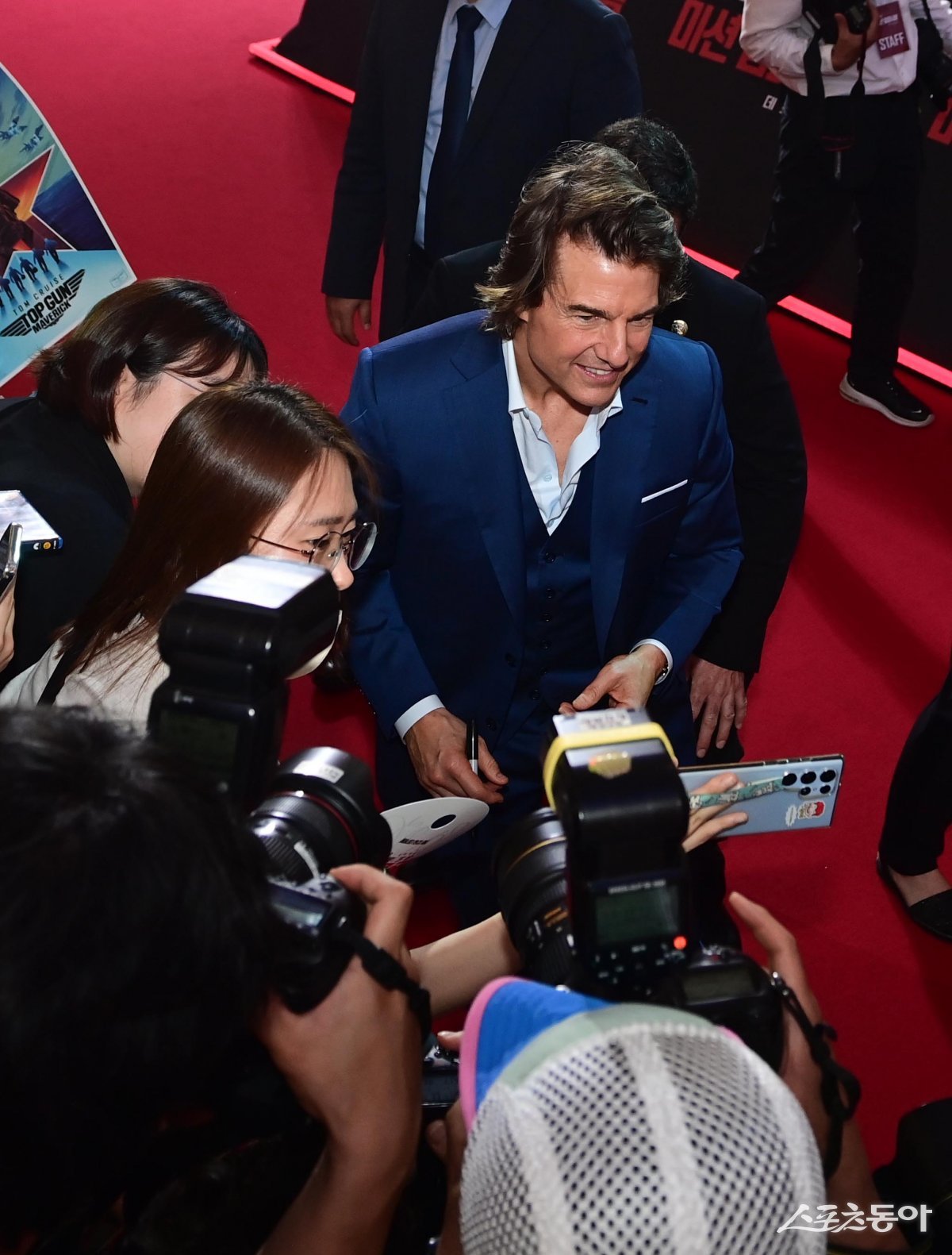 배우 톰 크루즈가 29일 서울 송파구 신천동 롯데월드타워몰에서 열린 영화 ‘미션 임파서블: 데드 레코닝 PART ONE’ 레드카펫 행사에서 팬과 기념 촬영을 하고 있다.