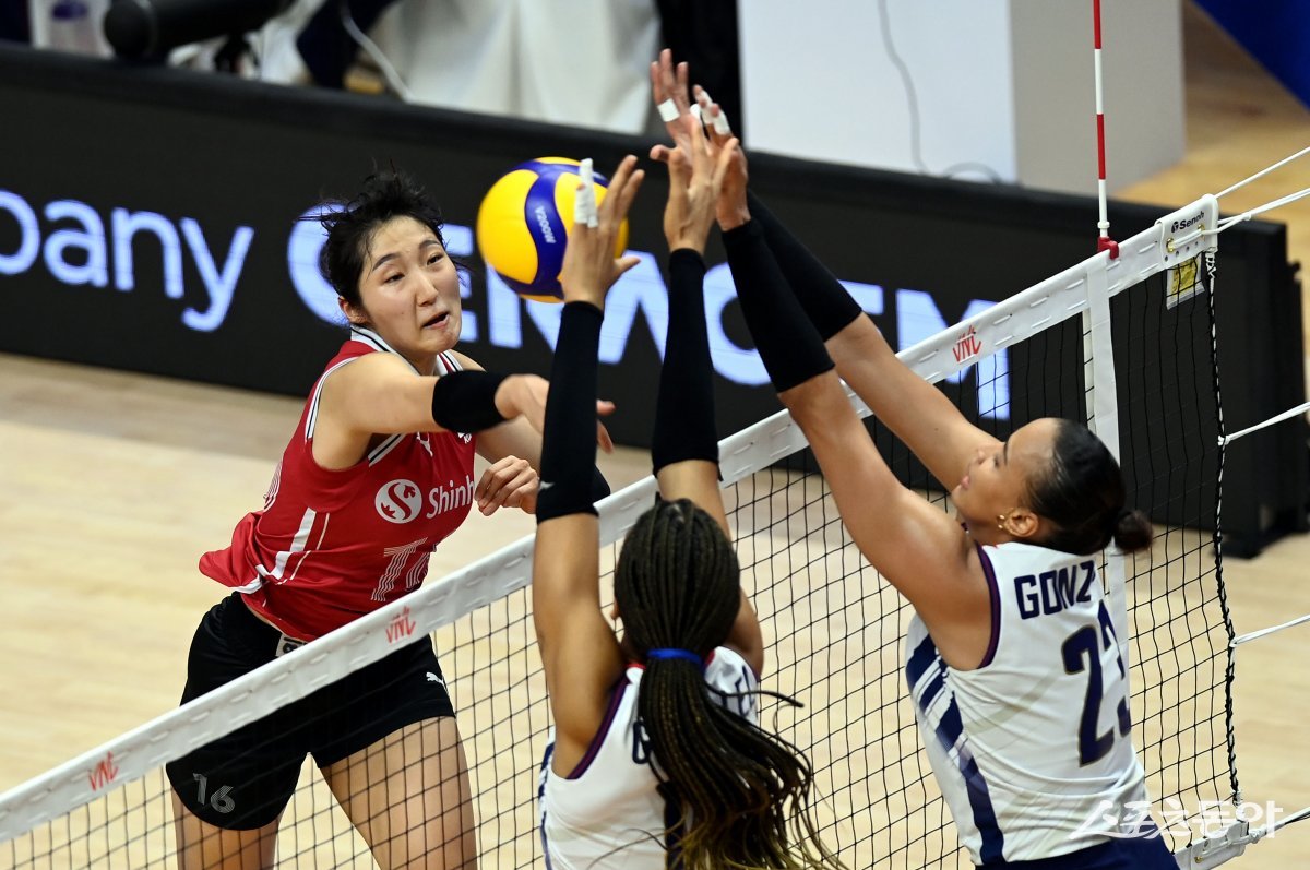 29일 경기도 서수원칠보체육관에서 ‘2023 국제배구연맹(FIVB) 발리볼네이션스리그(VNL)’ 한국과 도미니카공화국의 경기가 열렸다. 한국 정지윤의 공격이 상대 블로킹에 막히고 있다.