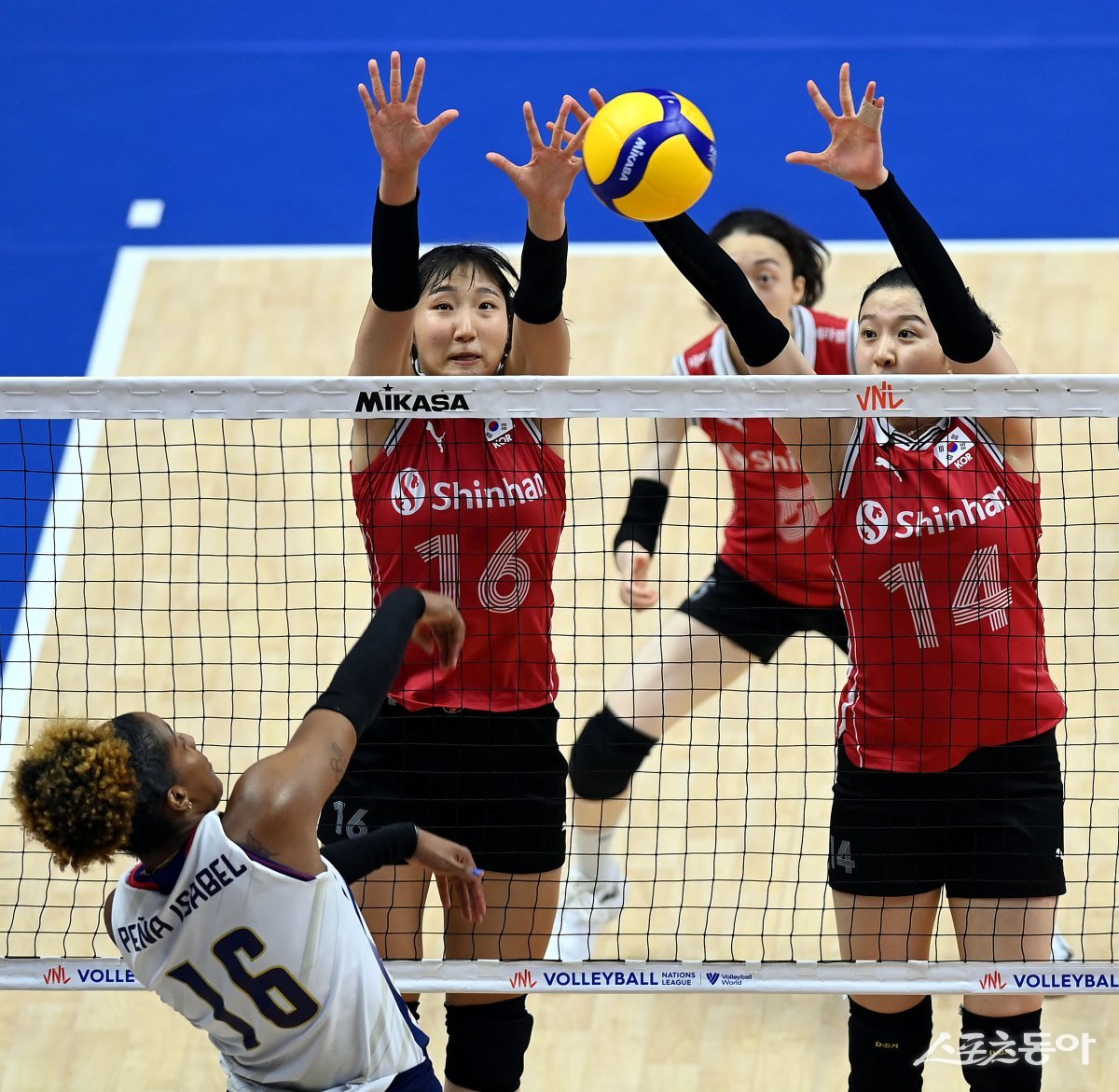 29일 경기도 서수원칠보체육관에서 ‘2023 국제배구연맹(FIVB) 발리볼네이션스리그(VNL)’ 한국과 도미니카공화국의 경기가 열렸다. 한국 정지윤과 이다현이 상대 공격을 막아내고 있다.