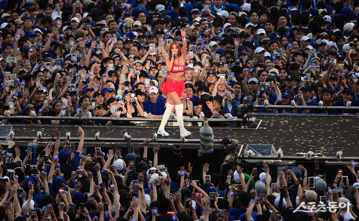 가수 제시가 30일 서울 잠실종합운동장 올림픽주경기장에서 열린 ‘싸이흠뻑쇼 SUMMER SWAG 2023’에서 공연을 하고 있다.