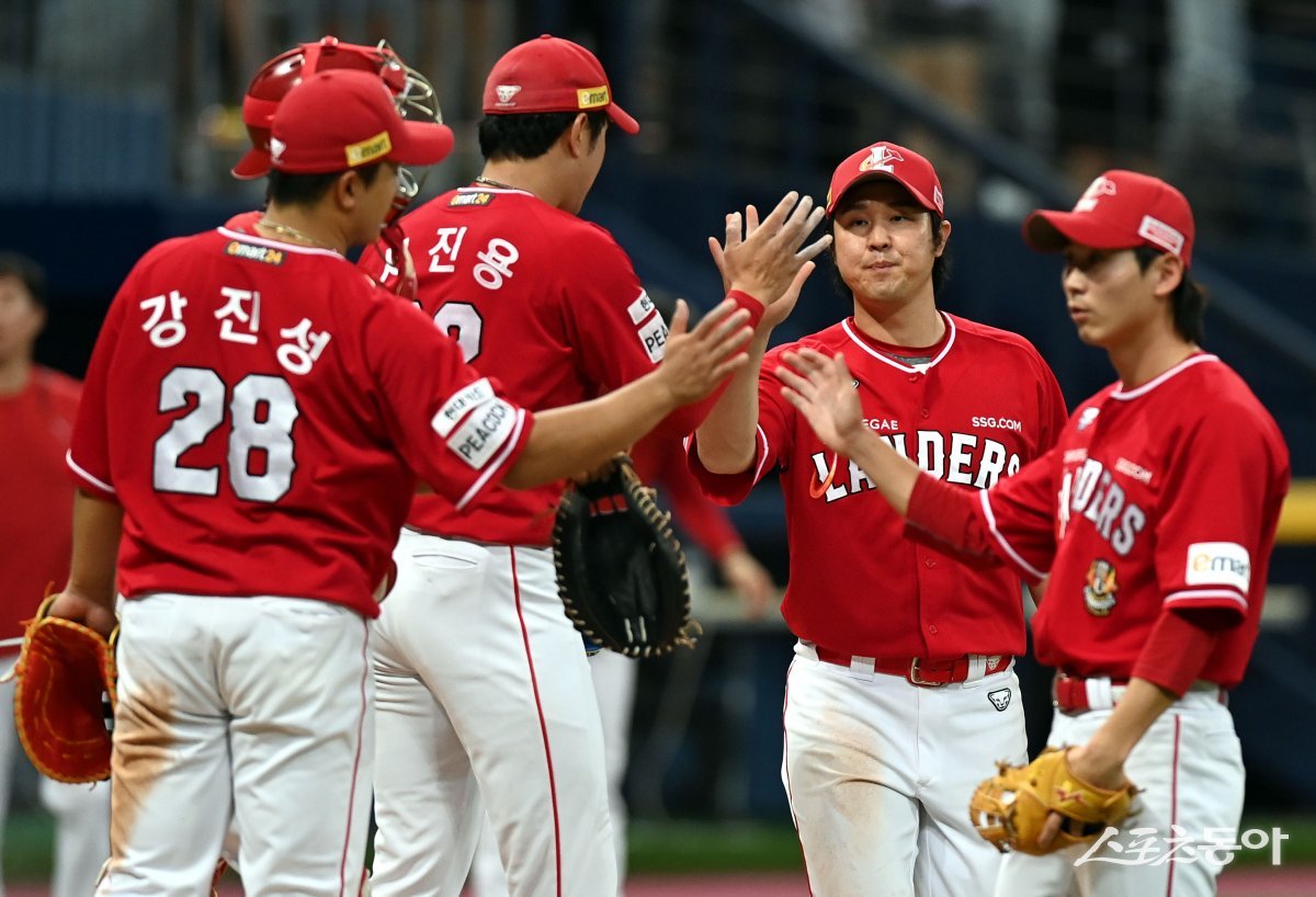 2일 서울 고척스카이돔에서 ‘2023 신한은행 SOL KBO리그’ 키움 히어로즈와 SSG 랜더스의 경기가 열렸다. SSG가 키움을 상대로 9-5로 승리한 후 선수들이 그라운드에서 기쁨을 나누고 있다.