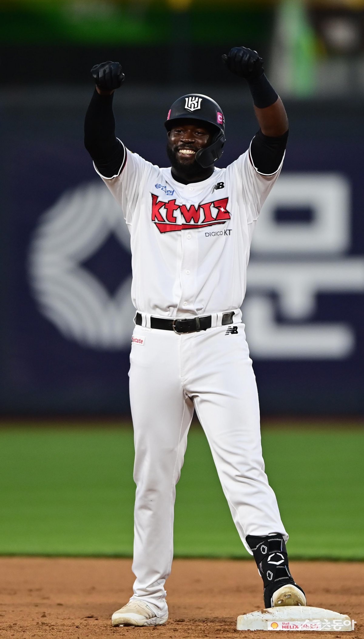 2일 경기도 수원KT위즈파크에서 열린 ‘2023 신한은행 SOL KBO리그’ KT 위즈와 NC 다이노스의 경기에서 8회말 무사 2, 3루 KT 알포드가 좌전 2타점 2루타를 친 후 세리머니를 하고 있다.