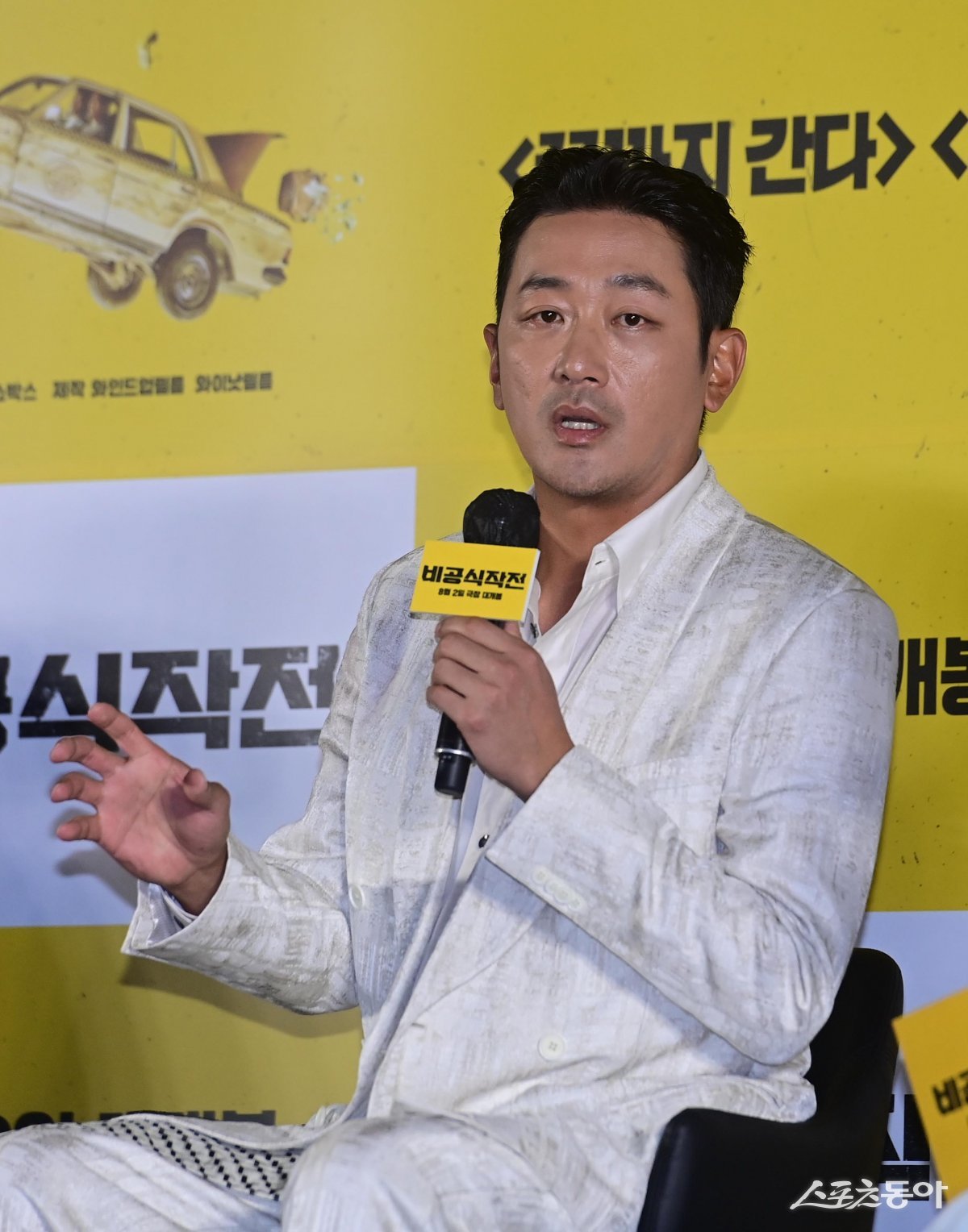 배우 하정우가 4일 서울 용산구 CGV용산아이파크몰점에서 열린 영화 ‘비공식작전’ 제작보고회에서 MC의 질문에 답하고 있다.