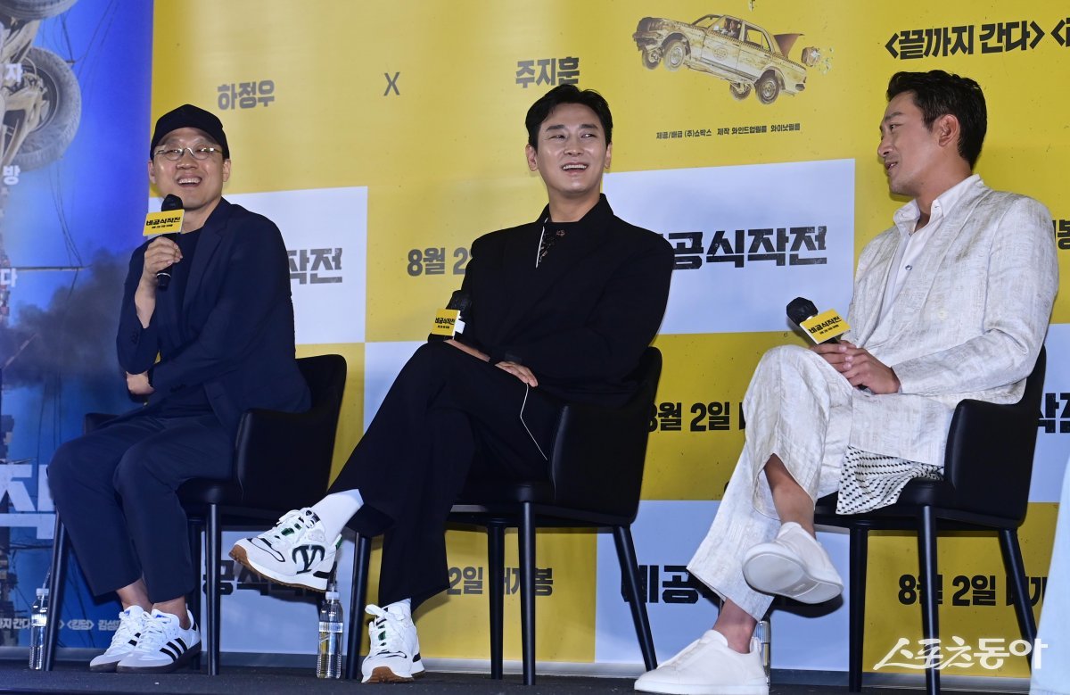 감독 김성훈, 배우 주지훈, 하정우가 4일 서울 용산구 CGV용산아이파크몰점에서 열린 영화 ‘비공식작전’ 제작보고회에서 MC의 질문에 답하며 웃고 있다.