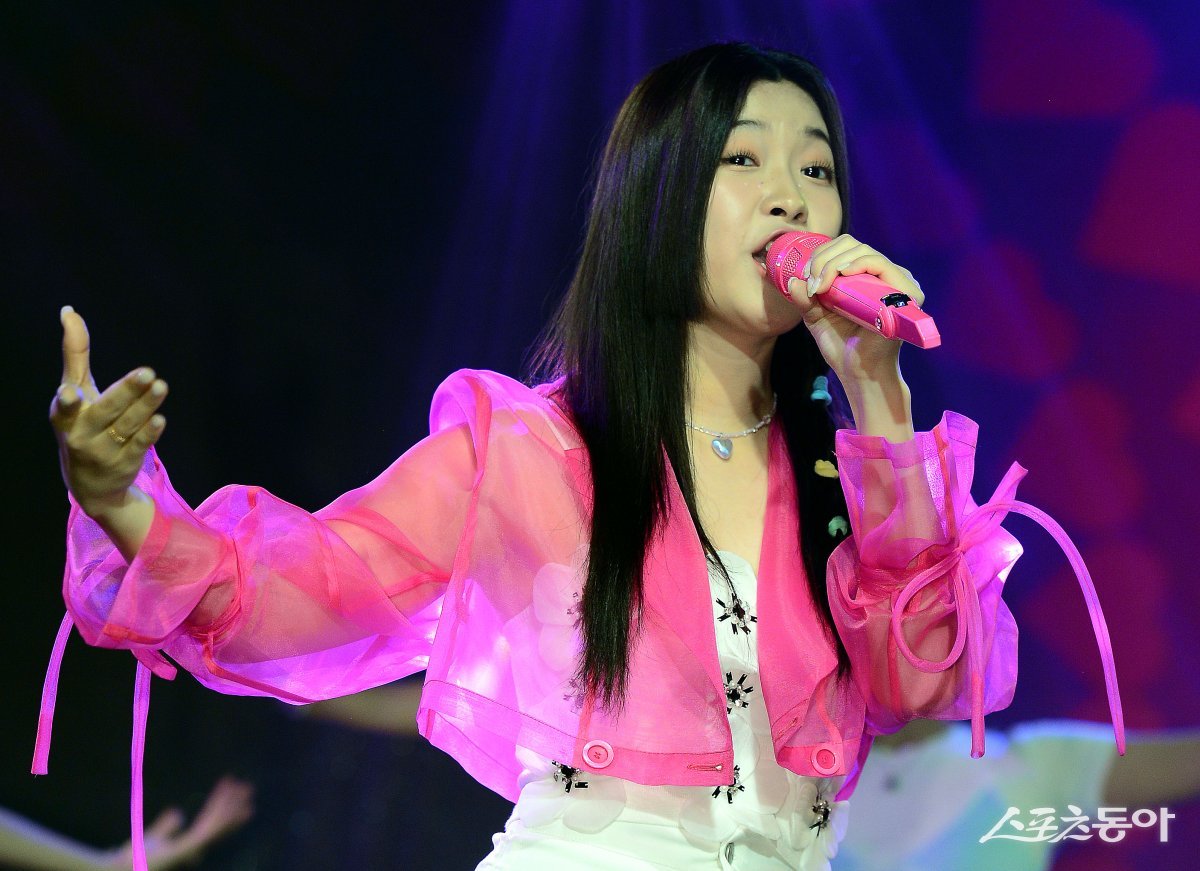 트로트 가수 성민지가 4일 서울 홍대 롤링홀에서 첫 번째 미니 앨범 ‘슈퍼스타’ 발매 기념 쇼케이스를 가졌다. 성민지가 ’천생연분‘을 부르고 있다.