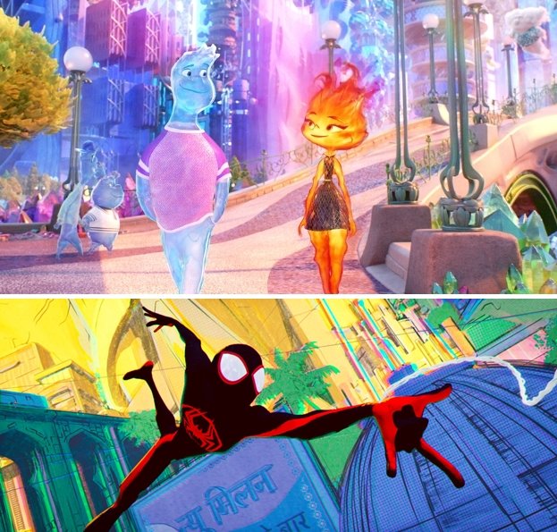 ‘엘리멘탈’은 웃고, ‘스파이더맨: 어크로스 더 유니버스’는 울었다. 애니메이션 영화 ‘엘리멘탈’(위)과 ‘스파이더맨: 어크로스 더 유니버스’가 엇갈린 국내 흥행 성적표를 받았다. 사진제공|월트디즈니컴퍼니 코리아·소니픽쳐스 코리아