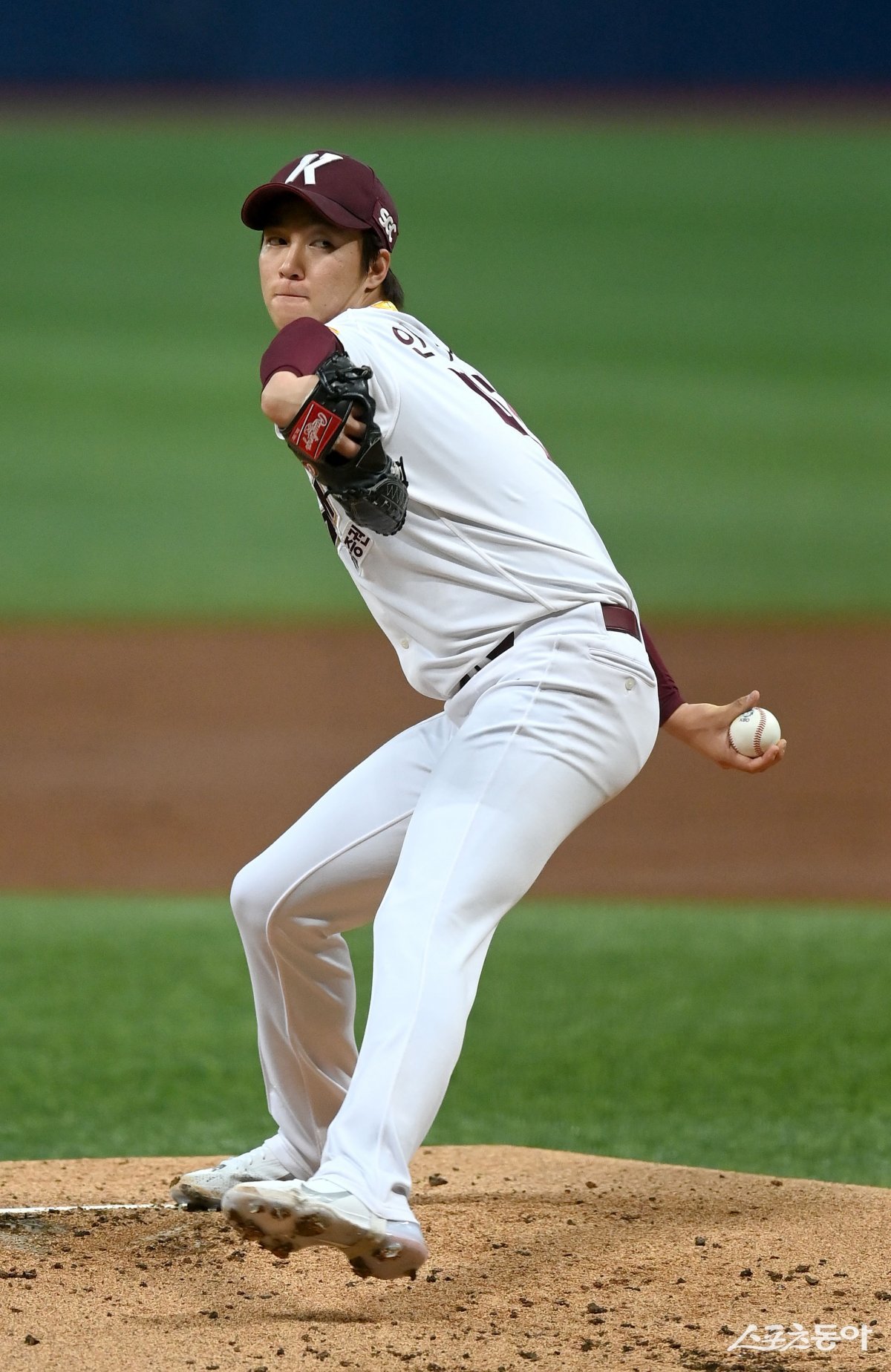 4일 서울 고척 스카이돔에서 ‘2023 신한은행 SOL KBO리그’ NC 다이노스와 키움 히어로즈 경기가 열렸다. 선발 투수로 등판한 키움 안우진이 역투하고 있다.