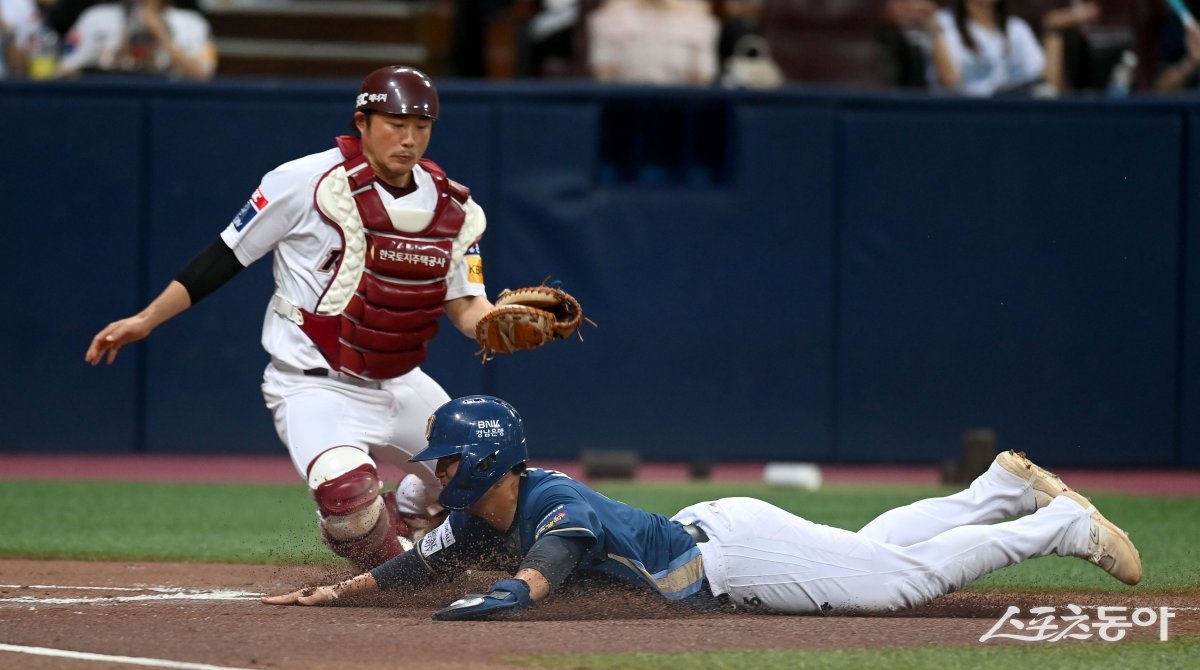 4일 서울 고척 스카이돔에서 ‘2023 신한은행 SOL KBO리그’ NC 다이노스와 키움 히어로즈 경기가 열렸다. 1회초 1사 1,3루 NC 외야 뜬공 때 3루주자 서호철이 태그업 시도해 홈에서 세이프 되고 있다.