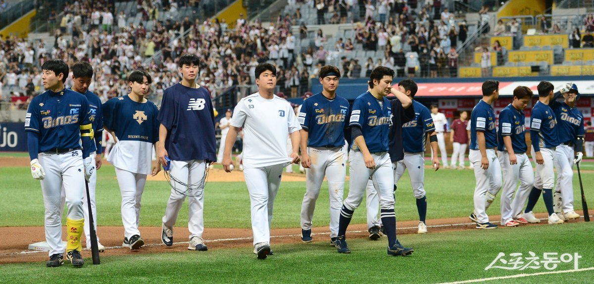 4일 서울 고척 스카이돔에서 ‘2023 신한은행 SOL KBO리그’ NC 다이노스와 키움 히어로즈 경기가 열렸다. 4-8로 패하며 4연패에 빠진 NC 선수들이 그라운드를 빠져나가고 있다.