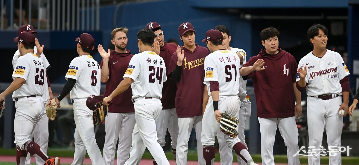 4일 서울 고척 스카이돔에서 ‘2023 신한은행 SOL KBO리그’ NC 다이노스와 키움 히어로즈 경기가 열렸다. 8-4 승리를 거둔 키움 선수들이 하이파이브 하고 있다.