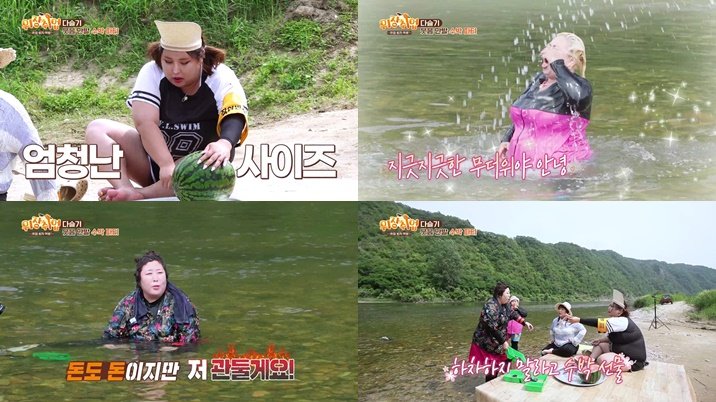이날 4인방은 ‘고용주’ 동강 계장님으로부터 ‘다슬기 20kg 채취하기’ 미션을 부여받는다. 이에 ‘작업반장’ 풍자는 작업 할당량을 나눠 멤버들을 감시하는데, ‘맏언니’ 김민경이 풍자에 이어 2등으로 할당량을 채운다. 반면 홍윤화와 신기루는 작업 속도가 더뎌지는데, 풍자는 두 사람에게 계장님에게 받은 수박을 보여주면서 “지금부터 개인기 콘테스트 열겠습니다”라고 선언한다.
