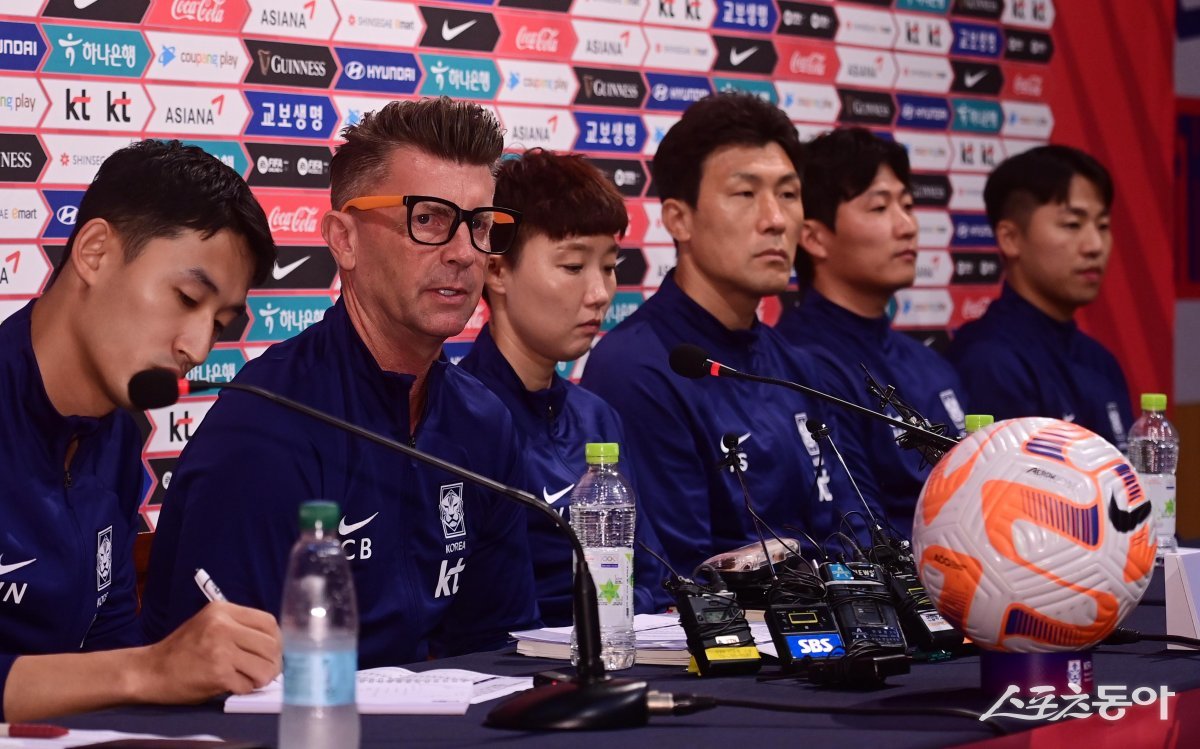 한국여자축구대표팀이 5일 경기도 파주 축구대표팀트레이닝센터(NFC)에서 ‘2023 피파(FIFA) 호주 뉴질랜드 여자 월드컵’ 최종명단을 발표했다. 한국 콜린 벨 감독이 기자회견에서 취재진의 질문에 답하고 있다.