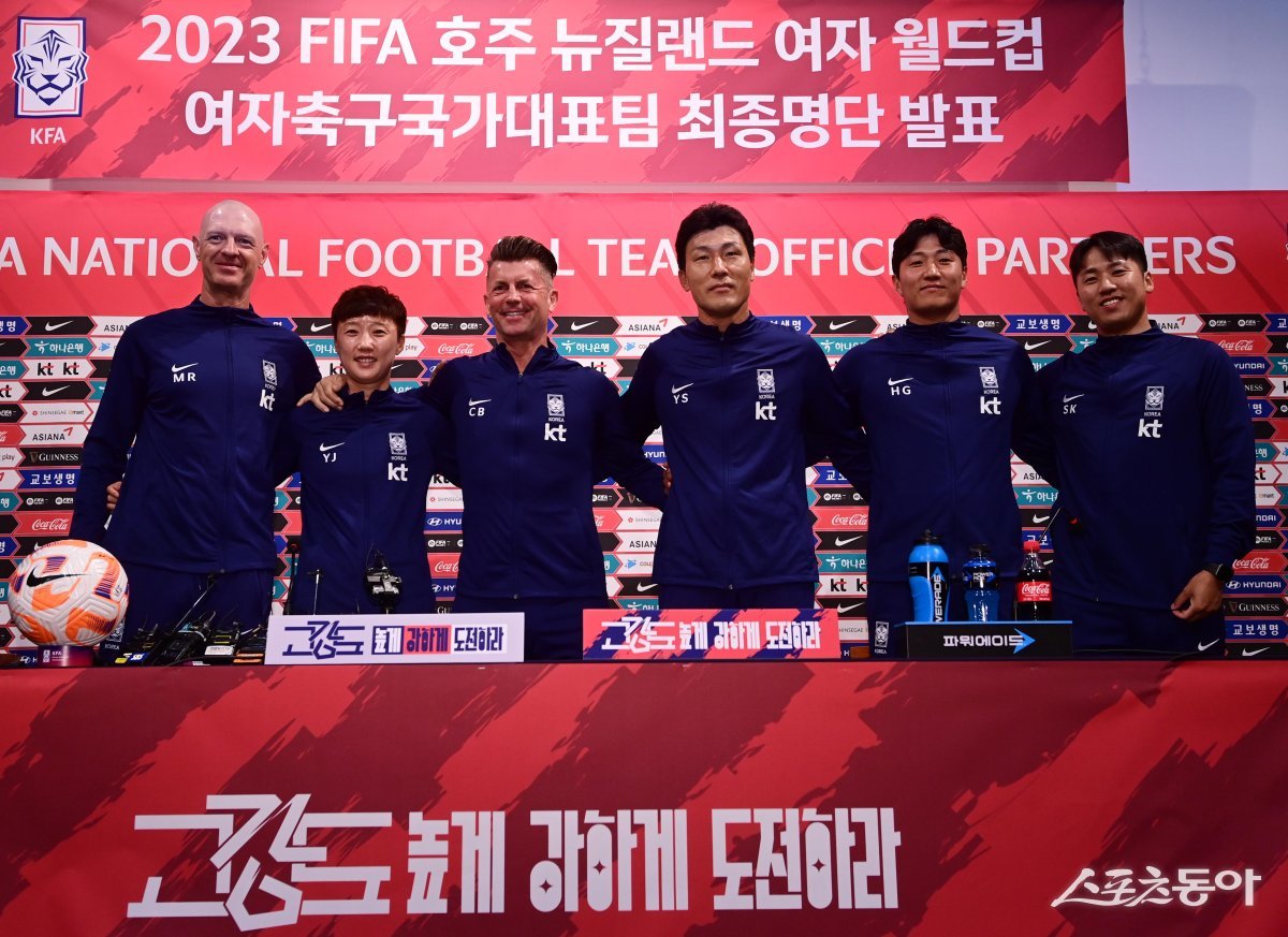 한국여자축구대표팀이 5일 경기도 파주 축구대표팀트레이닝센터(NFC)에서 ‘2023 피파(FIFA) 호주 뉴질랜드 여자 월드컵’ 최종명단을 발표했다. 맷 로스 코치, 박윤정 코치, 콜린 벨 감독, 정유석 코치, 정현규 코치, 정상권 비디오 분석관(왼쪽부터)이 기자회견을 마친 후 포즈를 취하고 있다.