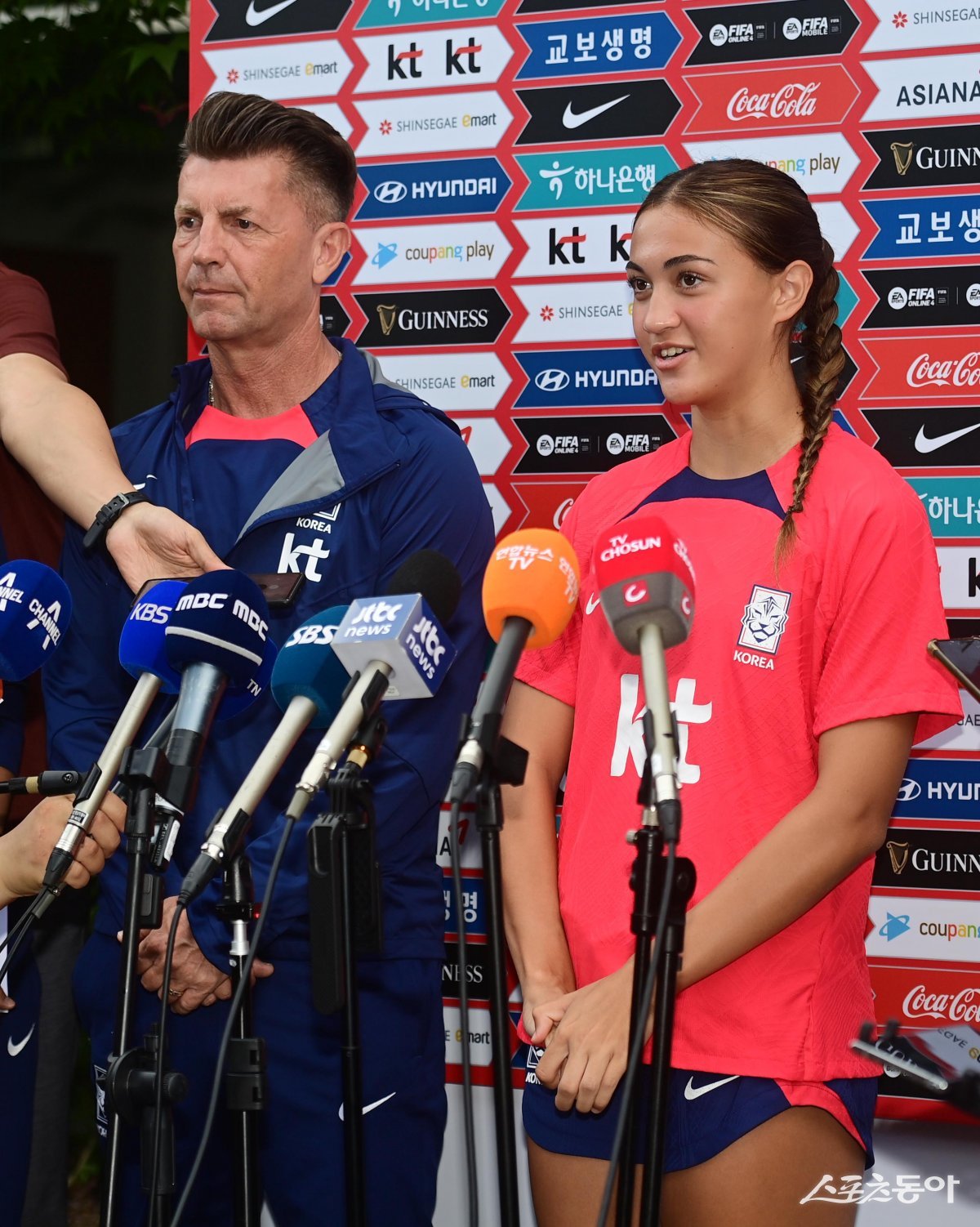 한국여자축구대표팀이 5일 경기도 파주 축구대표팀트레이닝센터(NFC)에서 ‘2023 피파(FIFA) 호주 뉴질랜드 여자 월드컵’ 소집 훈련을 진행했다. 훈련에 앞서 한국 케이시 페어가 콜린 벨 감독과 인터뷰를 하고 있다.