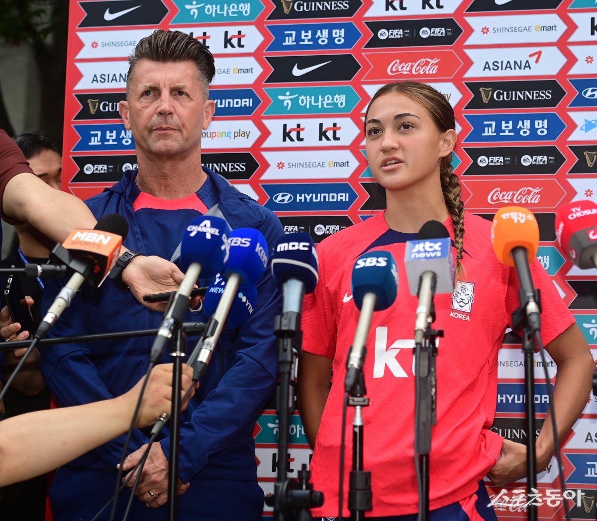 한국여자축구대표팀이 5일 경기도 파주 축구대표팀트레이닝센터(NFC)에서 ‘2023 피파(FIFA) 호주 뉴질랜드 여자 월드컵’ 소집 훈련을 진행했다. 훈련에 앞서 한국 케이시 페어가 인터뷰를 하고 있다.