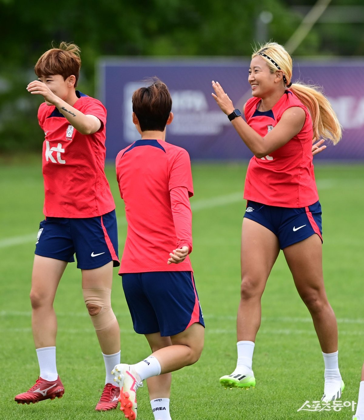 한국여자축구대표팀이 5일 경기도 파주 축구대표팀트레이닝센터(NFC)에서 ‘2023 피파(FIFA) 호주 뉴질랜드 여자 월드컵’ 소집 훈련을 진행했다. 한국 조소현(오른쪽)이 몸을 풀고 있다.