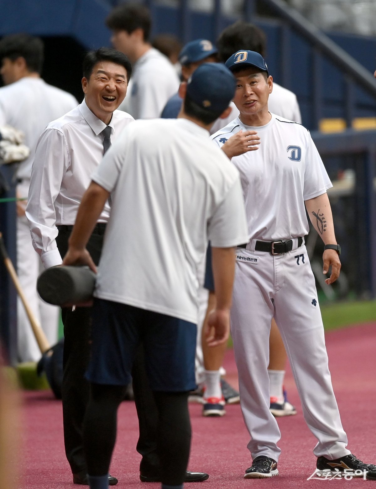 5일 서울 고척 스카이돔에서 ‘2023 신한은행 SOL KBO리그’ NC 다이노스와 키움 히어로즈 경기가 열린다. 정민태 해설위원과 송지만 코치가 이야기를 하고 있다.
