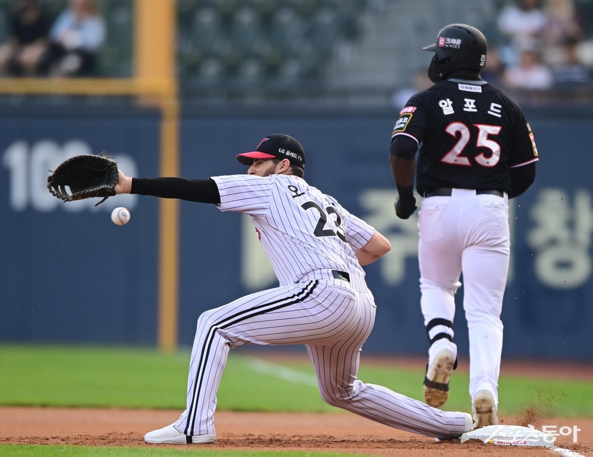 5일 서울 잠실야구장에서 열린 ‘2023 신한은행 SOL KBO리그’ LG 트윈스와 KT 위즈의 경기에서 1회초 2사 KT의 내야 안타 때 LG 1루수 오스틴이 송구된 볼을 놓치고 있다.