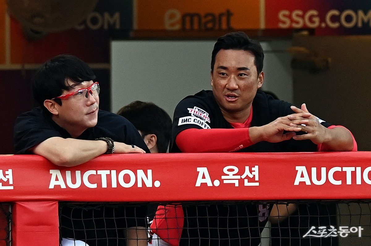 5일 인천 SSG 랜더스필드에서 ‘2023 신한은행 SOL KBO리그’ SSG 랜더스와 KIA 타이거즈의 경기가 열렸다. 삼성에서 KIA로 트레이드 된 김태군이 양현종과 기야기를 나누고 있다.