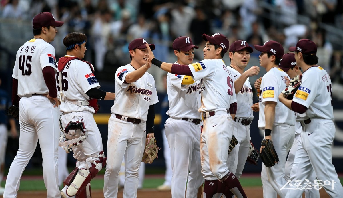 5일 서울 고척 스카이돔에서 ‘2023 신한은행 SOL KBO리그’ NC 다이노스와 키움 히어로즈 경기가 열렸다. 2-0 승리를 거둔 키움 선수들이 하이파이브 하고 있다.