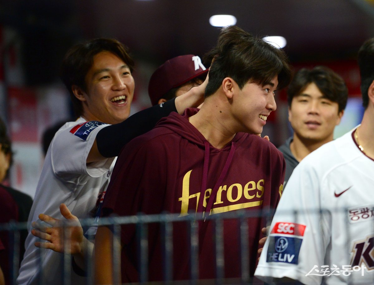 5일 서울 고척 스카이돔에서 ‘2023 신한은행 SOL KBO리그’ NC 다이노스와 키움 히어로즈 경기가 열렸다. 5.1이닝 무실점으로 데뷔 첫 승을 기록한 키움 장재영이 안우진의 축하를 받고 있다.