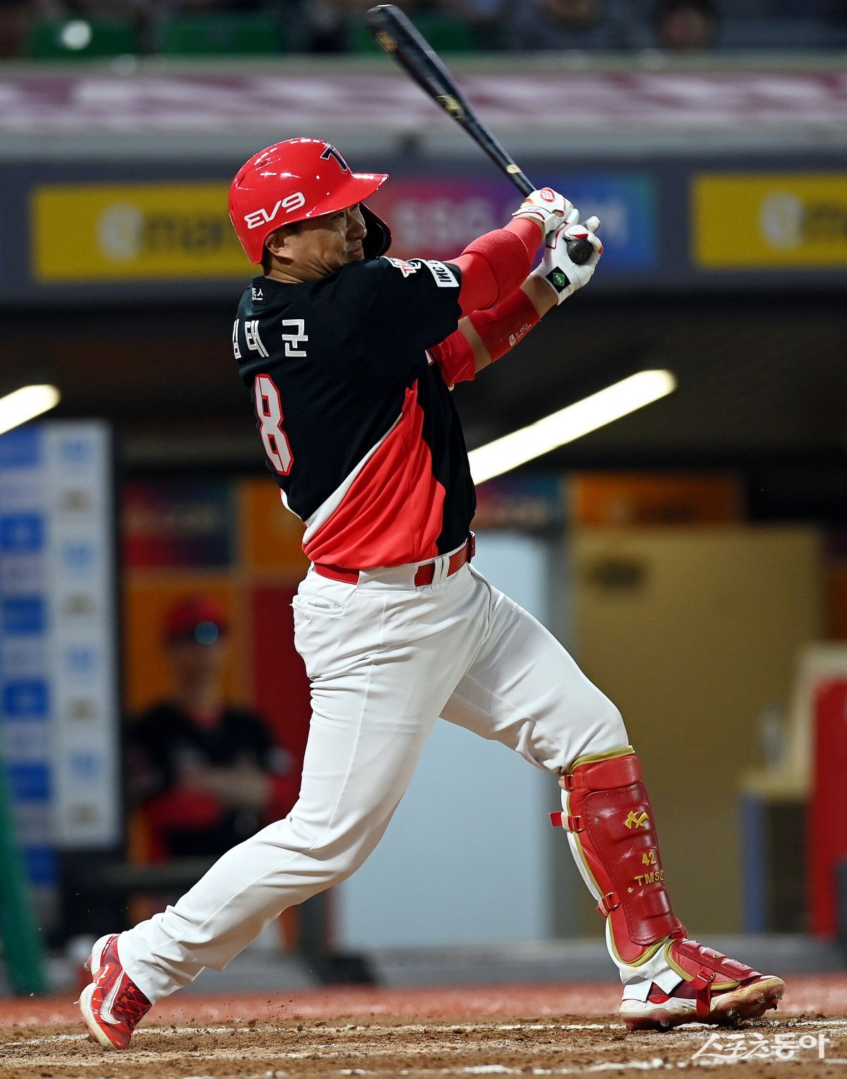 5일 인천 SSG 랜더스필드에서 ‘2023 신한은행 SOL KBO리그’ SSG 랜더스와 KIA 타이거즈의 경기가 열렸다. 9회초 무사 만루에서 KIA 김태군이 희생플라이를 날리고 있다.