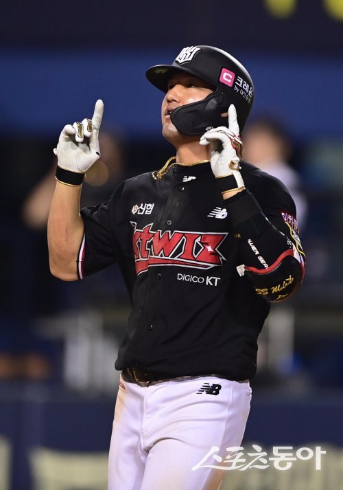 5일 서울 잠실야구장에서 열린 ‘2023 신한은행 SOL KBO리그’ LG 트윈스와 KT 위즈의 경기에서 8회초 1사 2루 KT 김상수가 좌월 2점 홈런을 친 후 세리머니를 하고 있다. 잠실 | 주현희 기자 teth1147@donga.com