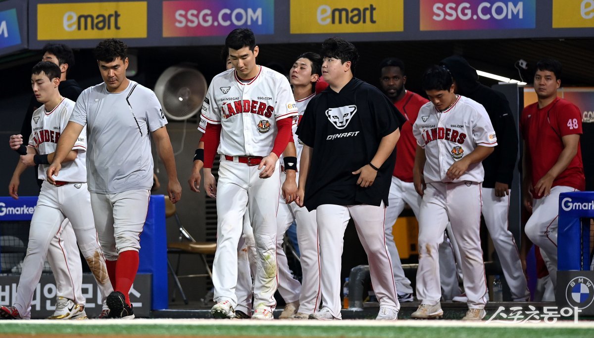 5일 인천 SSG 랜더스필드에서 ‘2023 신한은행 SOL KBO리그’ SSG 랜더스와 KIA 타이거즈의 경기가 열렸다. KIA에 3-17로 패한 SSG 선수들이 고개를 숙인채 그라운드로 나서고 있다.