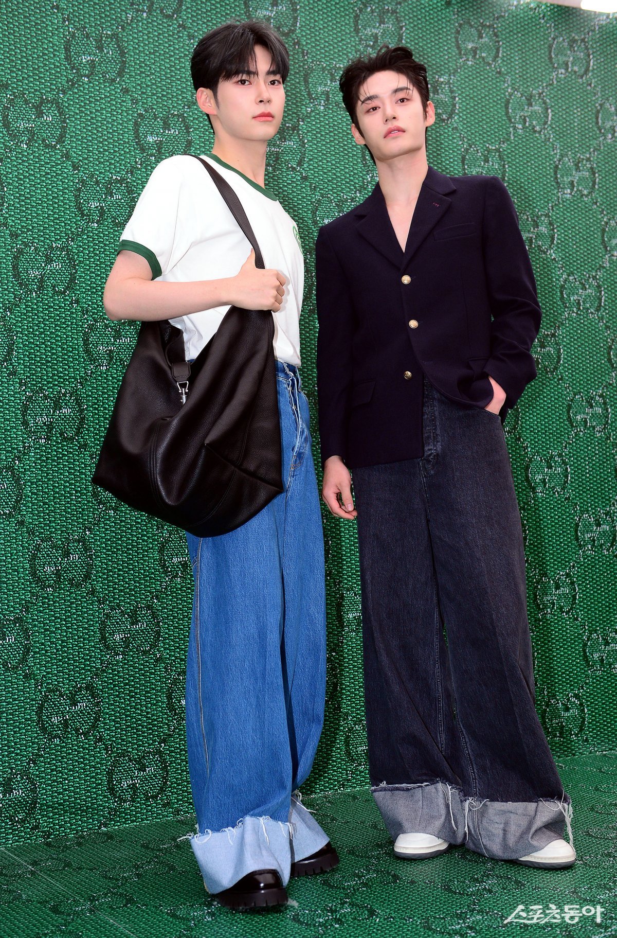 제로베이스원 한빈과 지웅이 6일 서울 용산구 이태원에서 열린 명품 브랜드 포토 행사에 참석해 포즈를 취하고 있다.