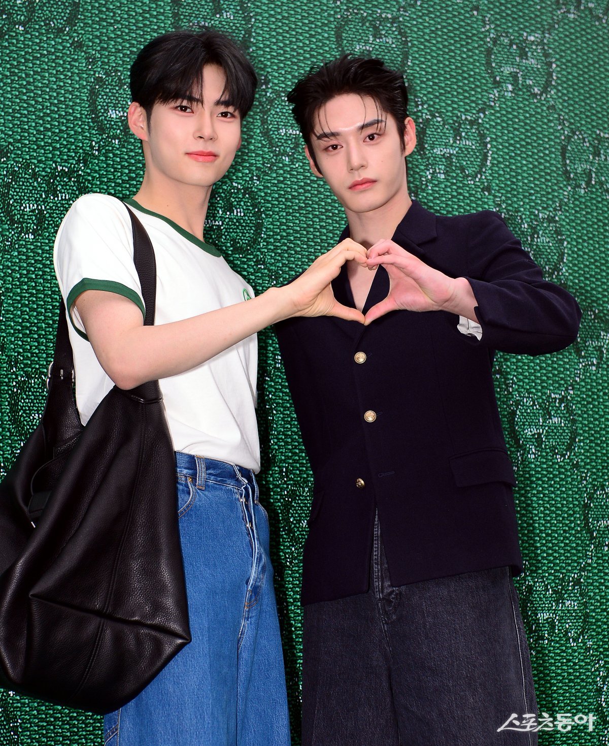 제로베이스원 한빈과 지웅이 6일 서울 용산구 이태원에서 열린 명품 브랜드 포토 행사에 참석해 포즈를 취하고 있다.