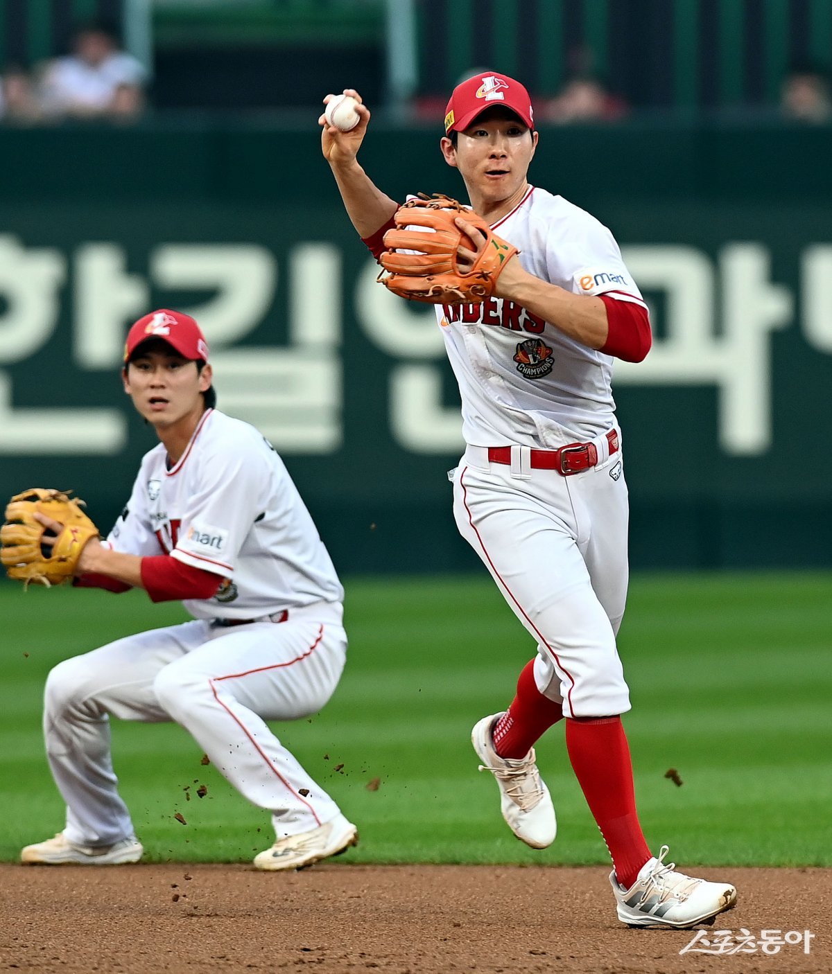 6일 인천 SSG 랜더스필드에서 ‘2023 신한은행 SOL KBO리그’ SSG 랜더스와 KIA 타이거즈의 경기가 열렸다. 2회초 1사에서 SSG 박성한이 내야땅볼 타구를 잡아 1루로 송구하고 있다.