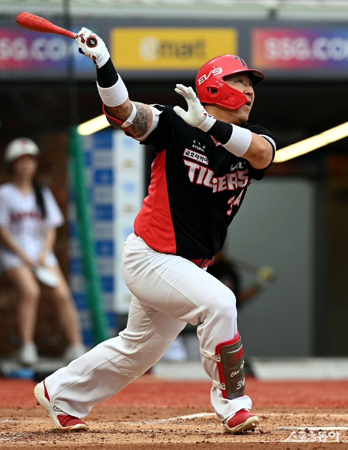 6일 인천 SSG 랜더스필드에서 ‘2023 신한은행 SOL KBO리그’ SSG 랜더스와 KIA 타이거즈의 경기가 열렸다. 2회초 무사에서 KIA 최형우가 동점 솔로 홈런을 쏘아 올리고 있다.